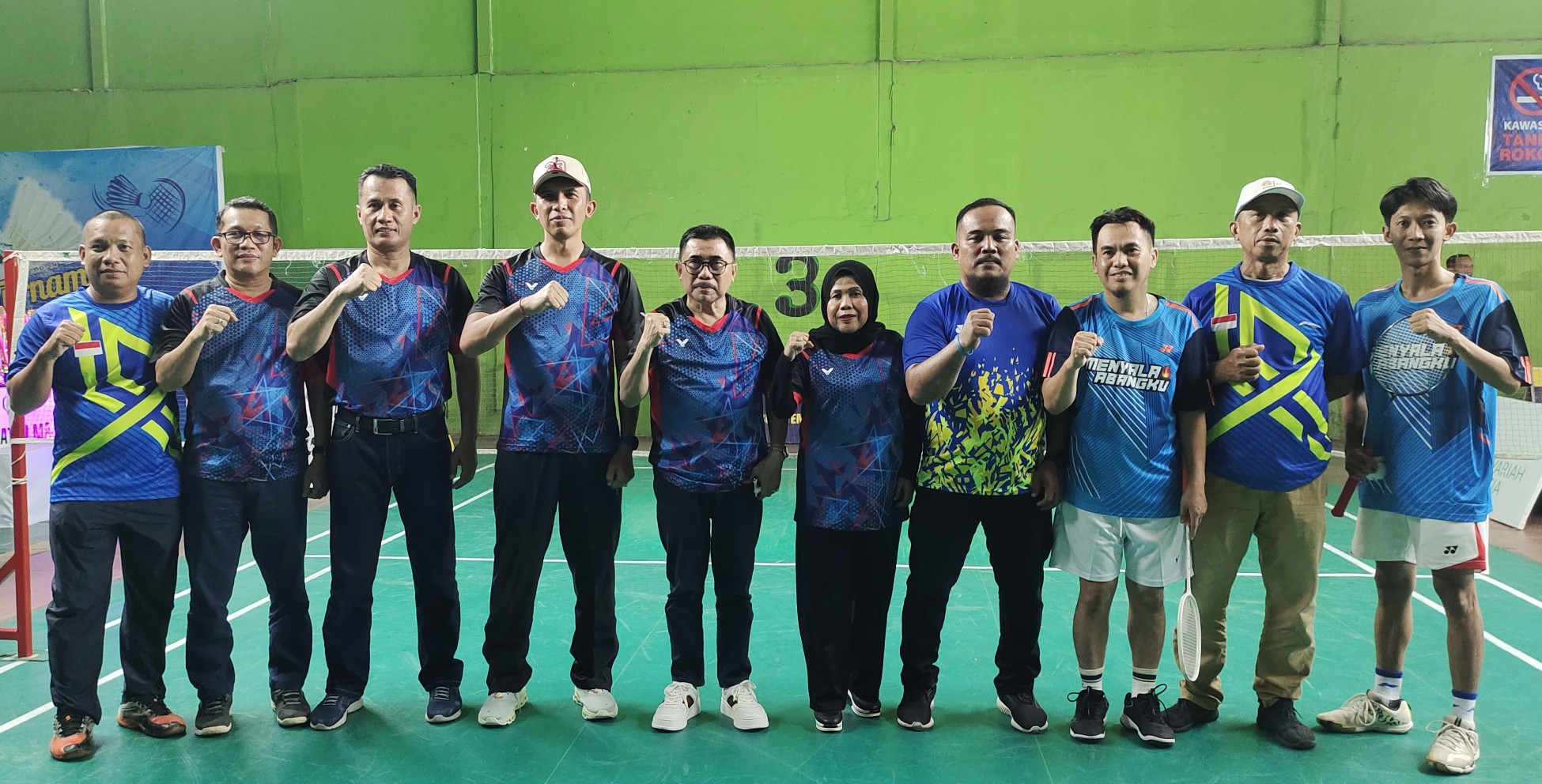 Gambar: Bupati Majene, Andi Syukri Tammalele Bersama Damdim 1401 Majene, Yang mewakili Kapolres, Kabag Keuangan, Anggota DPRD provinsi, Anggota DPRD kabupaten dan ketua panitia Pelaksana pada Kegiatan Open Turnamen bulutangkis.