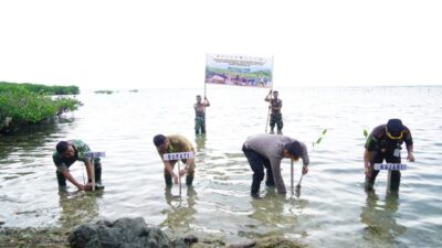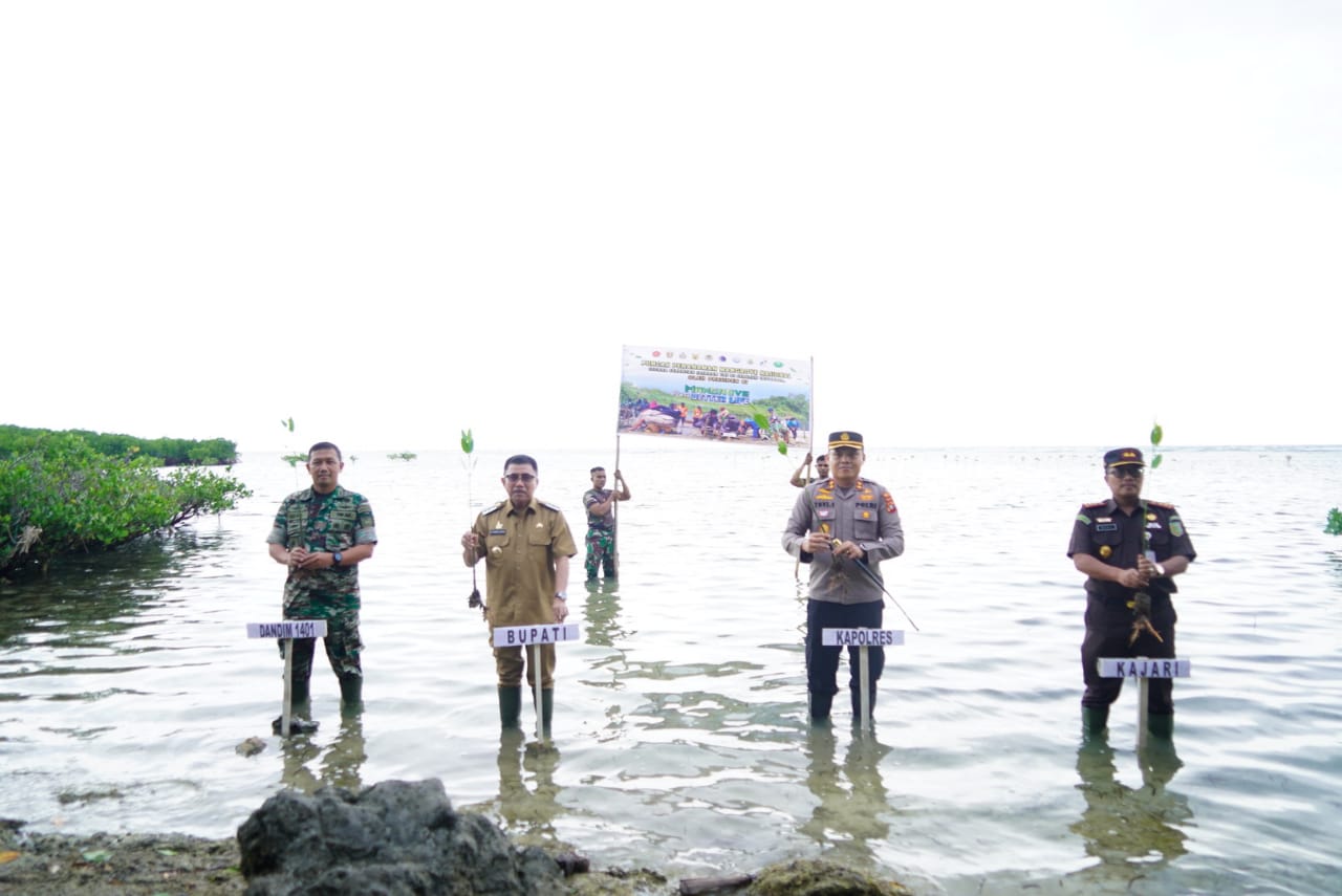 Turut menyemarakkan kegiatan Puncak Penanaman Mangrove Nasional yang dilaksanakan secara serentak jajaran TNI di seluruh Indonesia, Bupati Majene, Kodim 1401 Majene bersama Forkopimda, elemen masyarakat, mahasiswa, dan Polri melakukan penanaman mangrove di Desa Binanga, Kecamatan Sendana, Kabupaten Majene, Senin (15/5/2023).