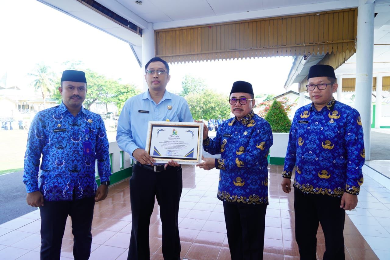 FOKUSTIMES – Bupati Majene H. Andi Syukri Tammalele. S.E., M.M yang didampingi kepala Badan Keuangan dan aset Daerah Kasman, S.E., M.M serta kepala bidang aset Muhammad Tamzil Yunus, S.STP menyerahkan sertifikat penghargaan kepada Kejaksaan Negeri Majene sesuai pelaksanaan Upacara Hari kesadaran Nasional yang berlangsung di Pendopo Rujab Bupati majene. Jum’at (17/11/2023).