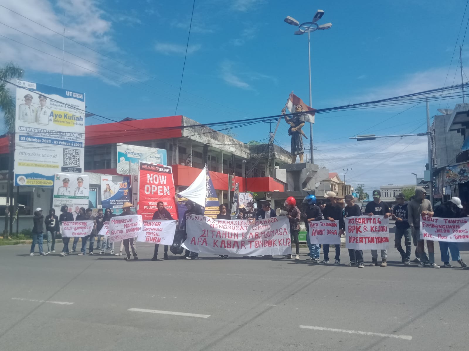 Majene, fokustimes.com– Puluhan Mahasiswa asal Kabupaten Mamasa yang tergabung dalam ‘Solidaritas Mahasiswa Mamasa Menggugat’ melakukan aksi Demonstrasi, Titik aksi depan Rektorat Unsulbar Menuju Patung juang Bundaran pusat pertokoan, Kabupaten Majene, Sabtu 11/3/2023.