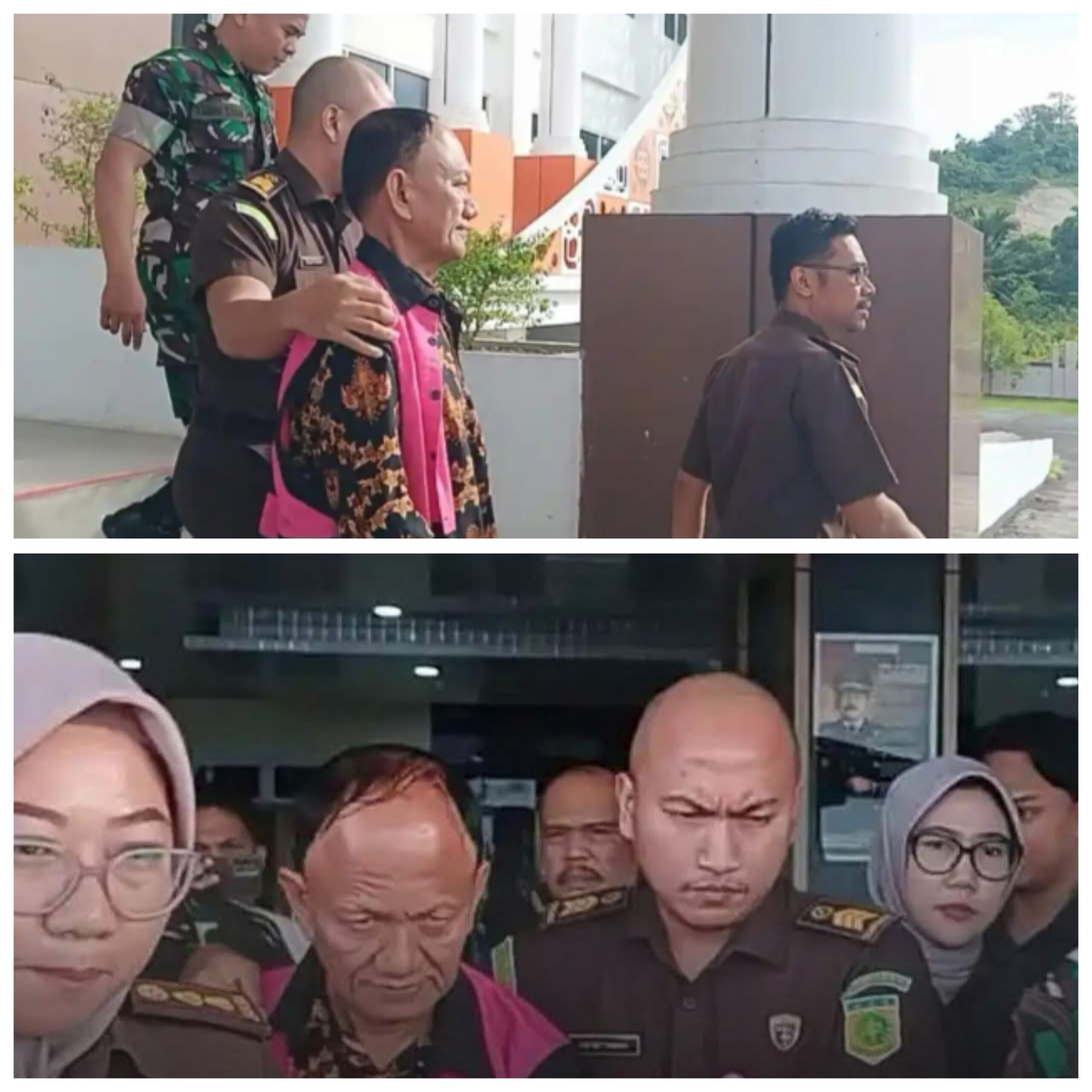 Nampak dia keluar mengenakan rompi pink, tanda penetapan tersangka. Terlihat AA dikawal oleh Aparat Penegak Hukum (APH) dari kejaksaan, polisi dan TNI.